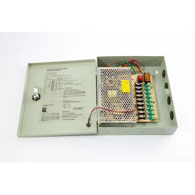 Equipo centralizado, canales independientes, controlados por led y fusible. Construcción profesional dentro de una caja metálica empotrable en el muro.Fuente de poder switching, de voltaje variable ajustable mediante potenciómetro, indicada para la alimentación de artículos electrónicos que funcionen con 12 voltios. Ideal para alimentación centralizada de cámaras de seguridad, ya que gracias a su control de voltaje variable, es posible compenzar las caídas de tensión asociada a la resistencia eléctrica de los cables muy largos. También recomendable para alimentar tiras de leds de alta intensidad.